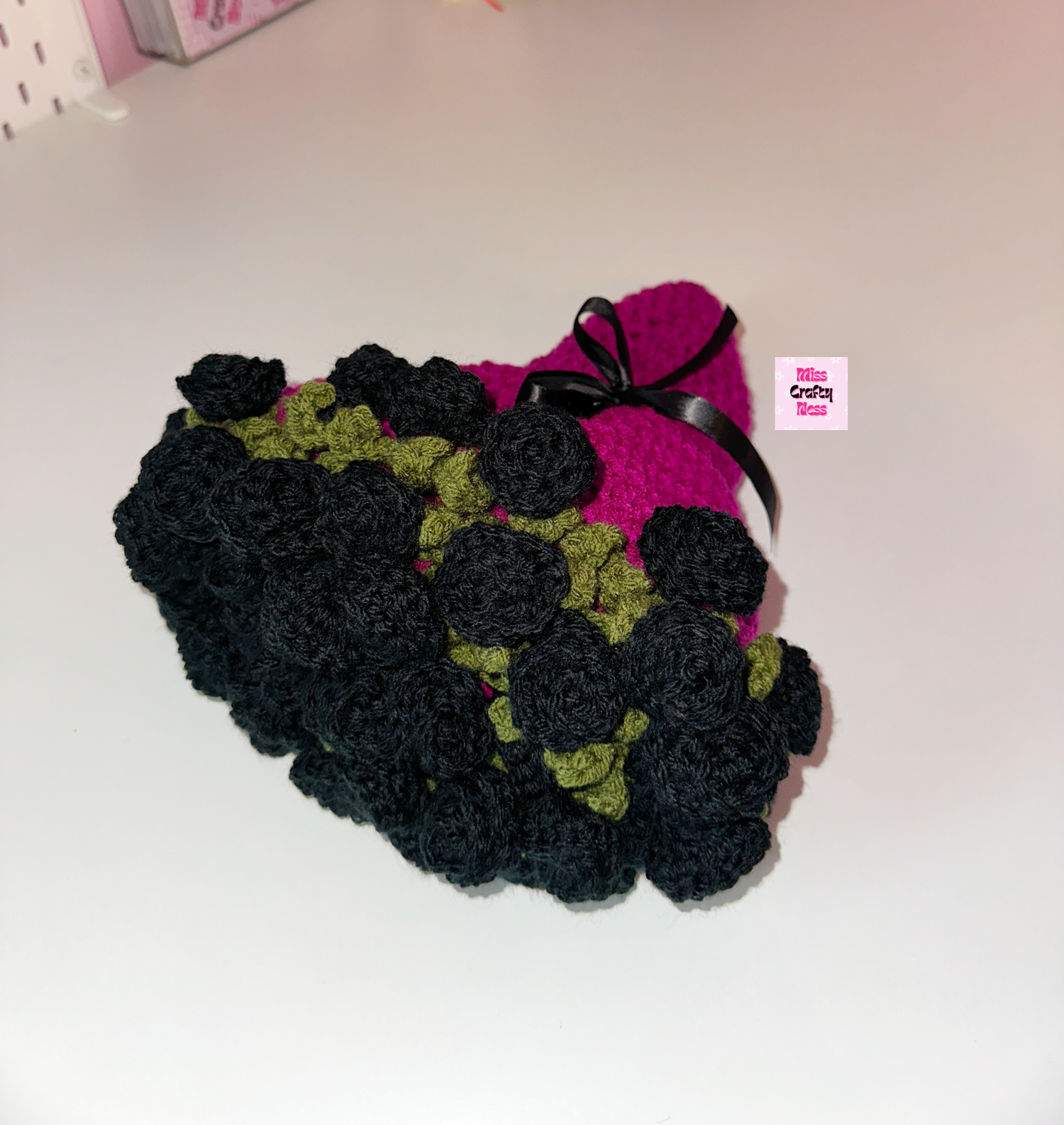 This cutie crochet dark rose bouquet blanket is the perfect gift and/or decoration!🖤🌹 it makes the perfect throw blanket for a couch, a bed or just leave it wrapped in the bow and put it in a vase! 💐