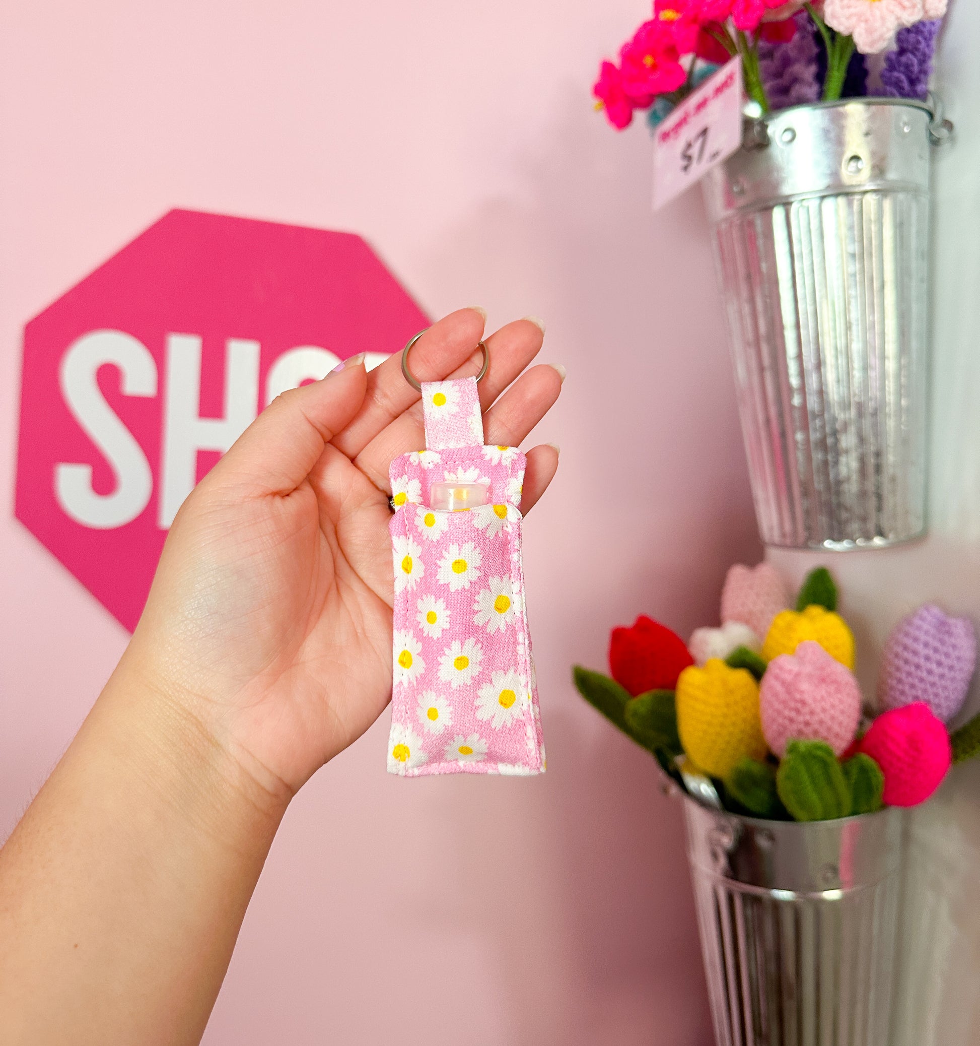 Pink daisies lip balm holder keychain